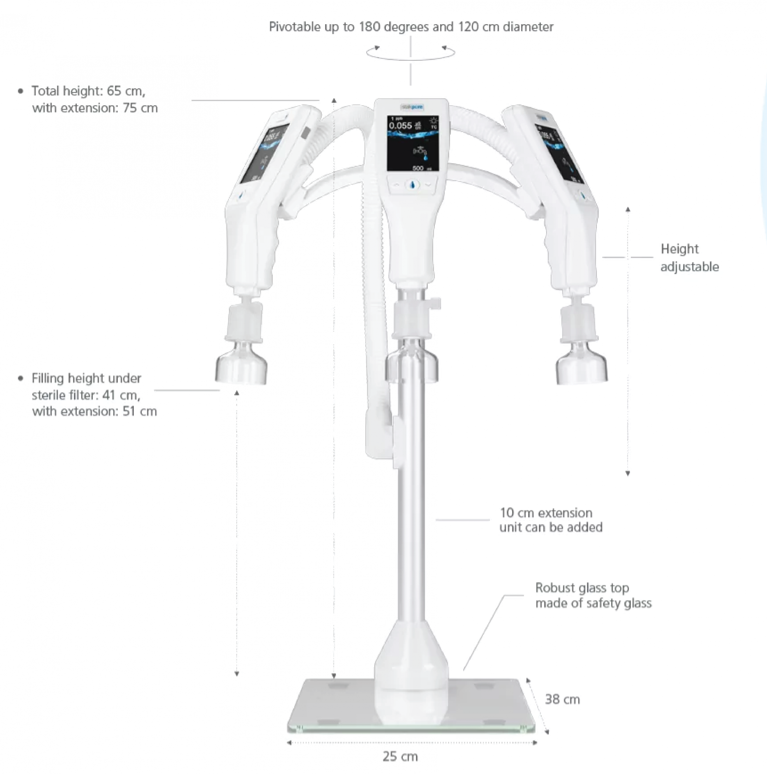 Make optimum use of the valuable space in your laboratory and position the production unit under the bench. With the external dispenser and monitoring unit OptiFill touch Table / Wall, you can adapt the positioning to your laboratory environment. Whether practically standing on the laboratory bench or space-saving on the laboratory wall.